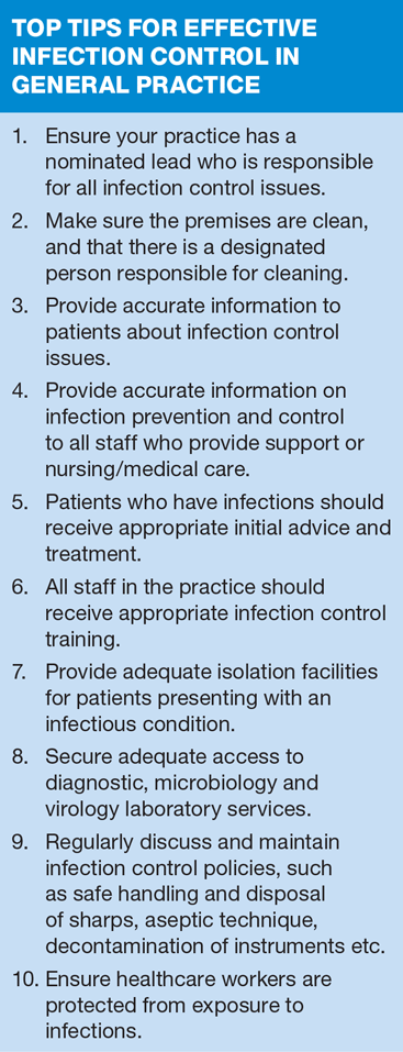 It is expected that healthcare providers should meet good hygiene standards; however, some practices are still running into difficulties. In 2015, more than one in five (22%) practices inspected by the independent healthcare regulator, the Care Quality commission (CQC), were found to require improvement in relation to infection control.1 This article aims to provide tips for practices to help them provide patient care in a clean and safe environment where the risk of infection to patients and staff is kept to the minimum.