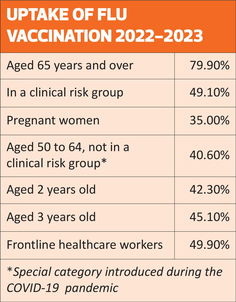 NHSE says: ‘The delivery of the NHS flu immunisation programme over recent seasons has been both ambitious and challenging as we sought to offer protection to as many eligible people as possible, exceeding the World Health Organization (WHO) target for those aged 65 years and above for a third season running.’2 However, this achievement was not matched in any other eligible group (See Table).
