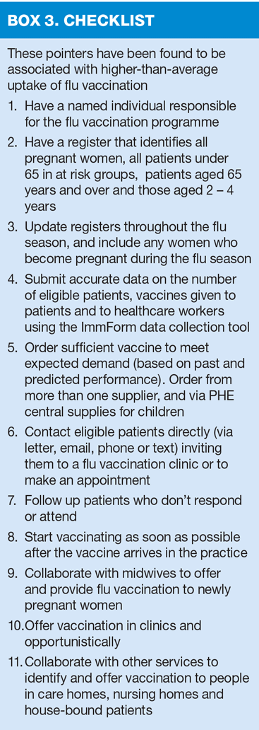 Ideally, vaccine should be given before flu starts to circulate, but it is important that vaccination is offered to any woman who becomes pregnant during the flu season. The perfect time for this to take place is at the woman’s first midwife appointment, but not every midwife is an independent prescriber, so practice nurses should check that vaccine has been given. Local NHS England teams are looking at ways of linking midwifery services with GP practices.