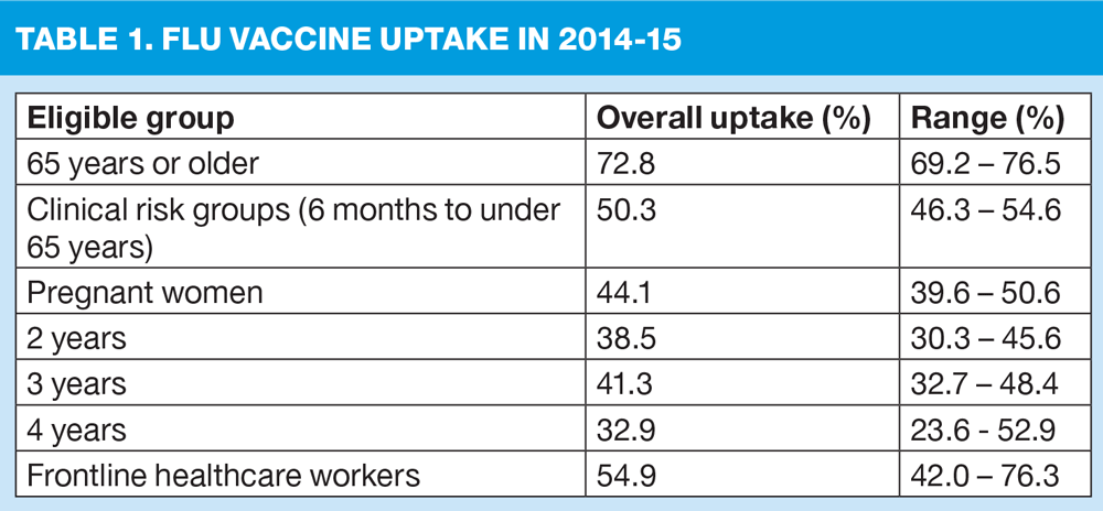 The Government’s target for uptake is – as it has been in previous years – at least 75%. As shown in Table 1, uptake last year fell well below this target, although PHE nonetheless thanked everyone ‘for their hard work’. ‘Vaccine uptake needs to improve,’ said PHE, ‘particularly in those who are at the highest risk of severe disease and mortality from flu but have low rates of vaccine uptake, including those with chronic liver and neurological disease, and people with learning disabilities.’