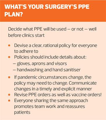 Clear, simple signage will be imperative.40 Examples of helpful instructions visible to all patients may include advice not to ask about any other medical problem; to ensure their jacket is removed and sleeve rolled up ready for their vaccine; and simply to maintain the one-way system through the surgery. When it comes to the flu vaccination consultation itself, some surgeries may choose to allow patients to only enter a small way into the room. Privacy is then provided, but needless contamination avoided. There may be a case for clear, wipeable screens to be used – a screen with a small window to vaccinate through. The installation of such barriers is highly effective in protecting staff.41 However, while creative proposals such as this can help in uncertain times, preparation is often then required to gather and assemble the materials, and questions may be raised over available funding.