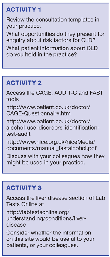 CLD is a disease area that is often overlooked in primary care yet is the fifth most common cause of death. Health care professionals need to appreciate that there is enormous potential to reduce the impact of the condition through recognition of risk factors and the provision of individualised, targeted education for all patients that are seen in practice — from the overweight child and the young adult going travelling, to the middle class or middle-aged drinker.
