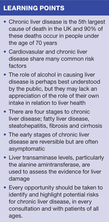 Chronic liver disease (CLD) is the fifth largest cause of death in the UK1 and 90% of these deaths occur in people under the age of 70. Yet liver disease is often overlooked in primary care, despite the fact that it is largely preventable. Initiatives such as the NHS health check programme focus on the prevention of cardiovascular disease (CVD). However, since CVD and CLD share several of the same risk factors, such schemes give us an ideal opportunity to educate the public about the risks of developing CLD, as well as CVD. At the same time we should not forget that increasing numbers of young people are developing signs of liver disease. We therefore need to be alert to every opportunity to discuss risk factors for liver disease in all age groups. Opportunistic advice can be offered in travel clinics, consultations for contraception or smear tests and other, routine consultations.