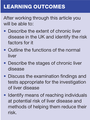 This article examines the role of the liver in health and reviews some of the main causes of CLD. The ways in which clinicians working in primary care can help raise the profile of liver disease with patients, and the importance of identifying those patients who are at risk in order that an early and accurate diagnosis is made, are discussed. Finally, interventions which may reduce risk and the ways in which they might be implemented are explored.