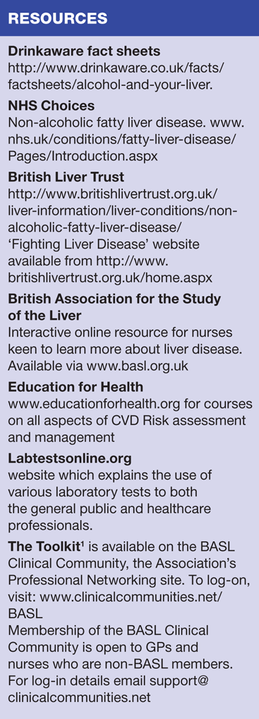 The link between obesity and CLD may not be obvious to many individuals. Obesity, however, can cause the fatty changes that are the precursors of fibrosis and cirrhosis to develop within the liver. Obesity registers in the practice could therefore be used to target at risk patients, as could the diabetes register, hypertension or CVD registers. The latest statistics from the Department of Health6 state that one-in-three children aged 2—15 years and two-in-three adults are overweight or obese, so there is potential for more NAFLD, and in younger people, in the future.