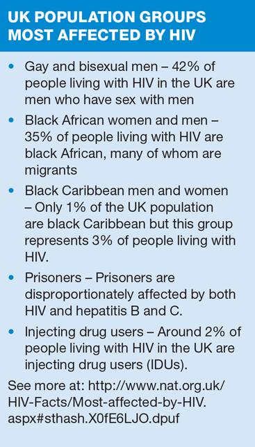 The development of successful antiretroviral therapy (ART) means people with HIV, who are diagnosed early and motivated to take their therapy, can expect a near normal life expectancy. Research in the Lancet in 2008 showed that a patient diagnosed today at age 20 can expect to live to nearly 70.1 According to the most recent figures from Public Health England, there were an estimated 98,400 people in 2012 living with HIV in the UK. Of these, 22% are unaware of their HIV infection. The overall prevalence of HIV is 1.5 per 1000 population. While some groups have a higher proportion of people living with HIV than others (Box 1) all areas of our society are affected, including the older person and more than 900 children under 15.2