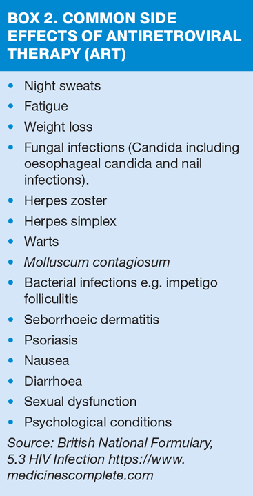 Practice nurses need to be aware that, although the benefits of antiretroviral therapy have been enormous for people diagnosed with HIV, these drugs are associated with a significant number of side effects, some of which are serious.13 Again many side effects will be managed by the specialist services but it is worthwhile having some knowledge in the event of a patient seeking advice. Some common side effects are listed in Box 2. While some of these effects, such as candidiasis or herpes simplex, may respond to conventional treatments they may be indicators of poor compliance with ART therapy, or be indicative of an underlying condition, so must be approached with caution. Management should always be discussed with a specialist clinician before action is taken.