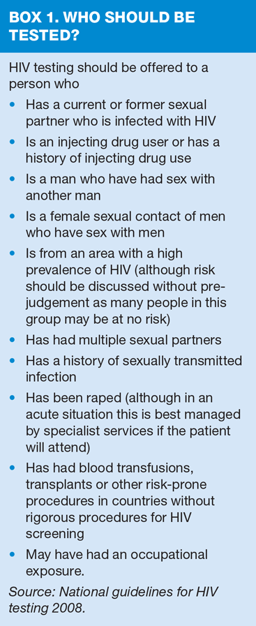 Late diagnosis is the most important factor associated with HIV-related morbidity and mortality: consequently, all providers of healthcare should strive to increase the uptake of HIV testing, in line with the UK Guidelines for HIV testing 2008.3 All GPs should routinely offer and recommend diagnostic HIV testing to patients, especially to those with associated risk factors. While testing for HIV is increasing in the general practice setting, there are still a number of reasons why it is not carried out. For example, practitioners may: