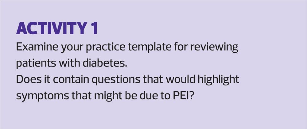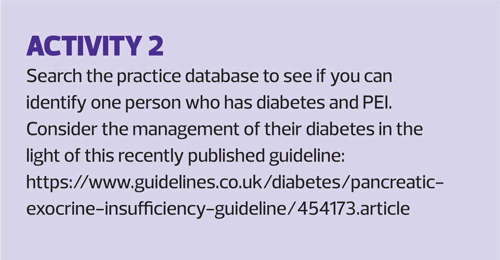 PEI is diagnosed through effective history taking and appropriate investigations, which may include blood tests, stool tests and scans. Management consists of lifestyle interventions (such as diet, smoking and alcohol advice) and PERT. GPNs should be aware that PEI in people with diabetes may be mistaken for drug reactions or complications such as neuropathic problems. It is therefore incumbent on the GPN to have an open mind, and to bear the possibility of PEI in mind when reviewing patients who report gastrointestinal symptoms.