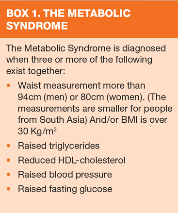 The metabolic syndrome (also sometimes called ‘syndrome X’) is a bit of a slippery fish. A syndrome is a set of medical signs and symptoms that frequently occur together, and which may be associated with a specific disease. There are many different definitions of the metabolic syndrome. The one given in Box 1 is a joint effort from the International Diabetes Federation and the American Heart Association published in 2009.7 It used to be thought that the common factor for the signs and symptoms of the metabolic syndrome was insulin resistance (the reduced ability in some people to react normally to insulin), but this simplicity is now disputed.8