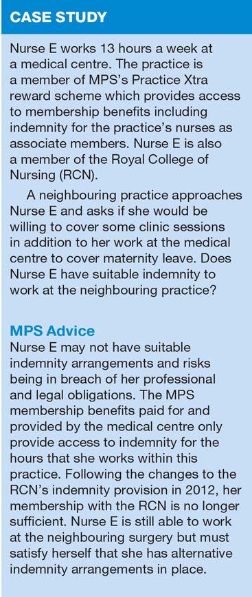 Changes to the Royal College of Nursing (RCN) indemnity arrangements in January 2012 have affected many nurses employed in general practice as they withdrew indemnity cover for work carried out under a practice nurse's contract of employment.3