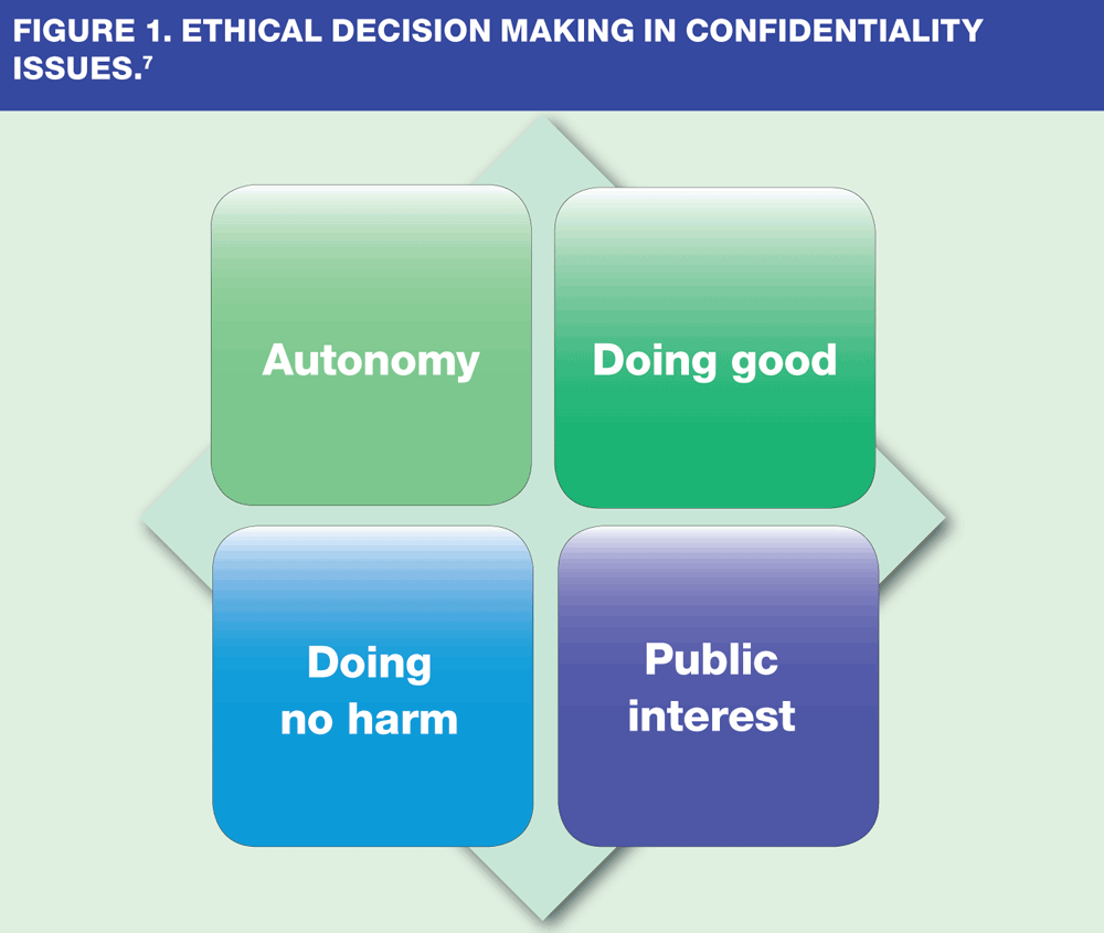 Confidentiality is an ethical duty, and we can use ethics to help us apply it.6 This involves weighing up not only the patient’s expressed (or unexpressed) wishes, but also the public interest, and harm versus good. (Figure 1) When deciding whether we must observe confidentiality in a specific situation we need to consider the patients best interests – the balance of harm and good – but we must also consider their autonomy and the public interest.