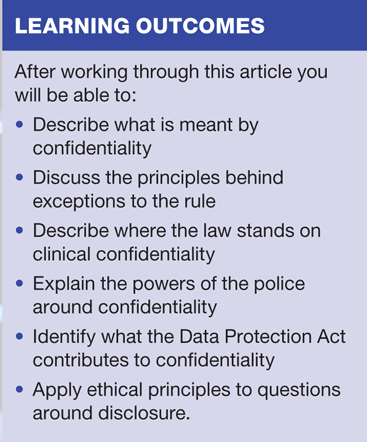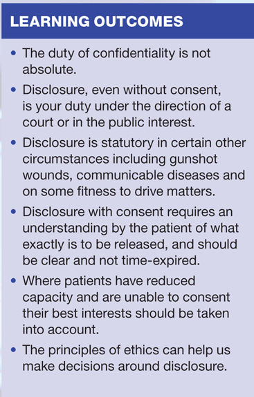 Maintaining a patient’s confidentiality is fundamental to good medical and nursing practice, but it is not always straightforward or easy. There are circumstances where breaches of confidentiality are either mandatory or in the patient’s or public’s best interest. An understanding of the legal and ethical issues around disclosure of information can help us make appropriate decisions.