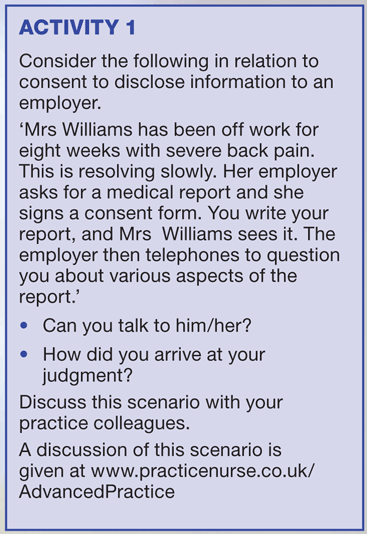 Confidentiality is part of good medical and nursing practice.4 It is a condition of registration that we, as health professionals abide by our registering bodies’ guidance on this issue. The legal imperative to maintain confidentiality will also be covered in a confidentiality clause in your employment contract.