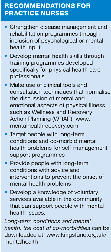 Practice nurses should develop awareness of mental health problems in people with long-term conditions, advises a new report.