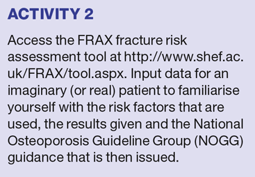 NICE has produced a short clinical guideline ‘Osteoporosis – assessing the risk of fragility fracture’.3 This provides a useful algorithm, guiding health care professionals through fragility fracture assessment for people in different age groups, from 40 upwards. While this helps determine when assessment of a person’s risk of fracture may be pertinent, in terms of scanning and doing a FRAX assessment, it does not provide any thresholds for treatment and refers users to local protocols or other guidelines instead. The Scottish Intercollegiate Guidelines Network (SIGN) has also produced guidelines on the management of osteoporosis.4 These are currently under review.