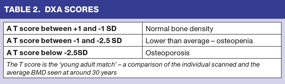 Bone density scanning, using dual energy absorptiometry (DXA) scan of the axial skeleton (using the lumbar spine and hip), is considered to be the ‘gold standard’ of diagnostic techniques. There is a high correlation between a low bone mineral density (BMD) and the risk of fractures. The scoring system used for DXA results (table 1) was devised by the World Health Organization in 1994,2 and has since been adopted as a diagnostic and intervention threshold.