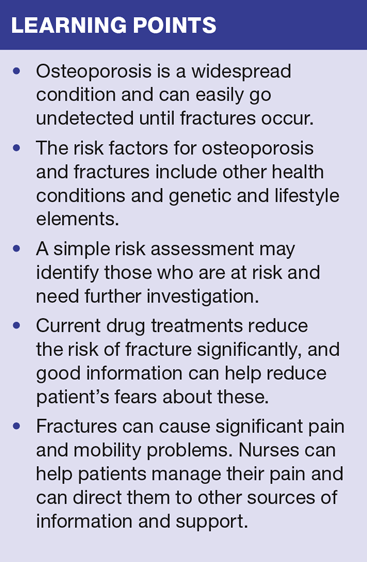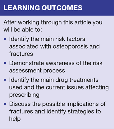 In the UK someone suffers a fragility fracture every 2 minutes. Our ageing population, our greater awareness of the risks associated with osteoporosis and fractures, coupled with increasing pressures on the NHS, means that practice nurses will be involved in the management of many patients with the condition