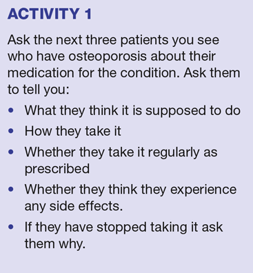 Good communication between the patient and their health care team is crucial to ensure that the right drug is prescribed, and that it is taken correctly. Within 12 months of starting drug therapy, approximately 75% of women no longer take it as prescribed, and almost 50% have discontinued it completely.9 Osteoporosis itself causes no symptoms and, similarly, the drug treatments cause no feeling of improvement. Unless this is explained some patients may feel that their drug is not working; they don’t feel any different so they stop taking it.10