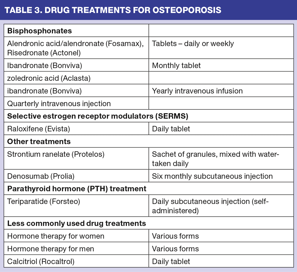 There is a range of drug treatments for osteoporosis (table 2). All aim to reduce the risk of fractures. Even though the likelihood of a fracture while on one of these drug treatments is significantly reduced (by around 50%), it is still possible to sustain a fracture. Often this is poorly explained to the patient, or poorly understood by them, and they then view a fracture as a sign that their treatment is not working.
