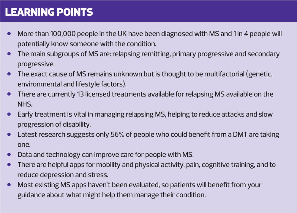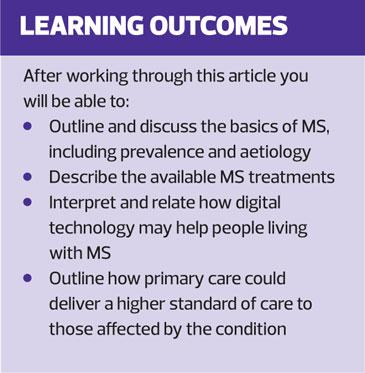 Multiple sclerosis (MS) is an unpredictable condition that affects more than 100,000 people in the UK. While it is unlikely that the average general practice nurse would treat MS, there is a role for the practice nurse in supporting those affected, and an emerging role for digital technology