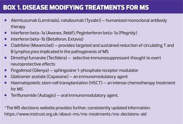 While MS has no cure, there are effective treatments available for the relapsing forms of the condition, relapsing remitting MS and secondary progressive MS with relapses. These are known as disease modifying therapies DMTs).1 DMTs can reduce the number and severity of relapses, and can also slow down the build-up of the damage caused by relapsing MS over time.(Box 1)
