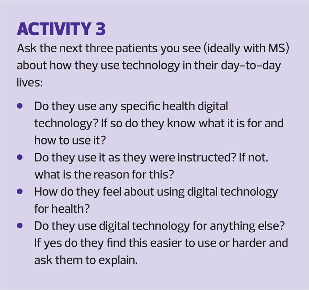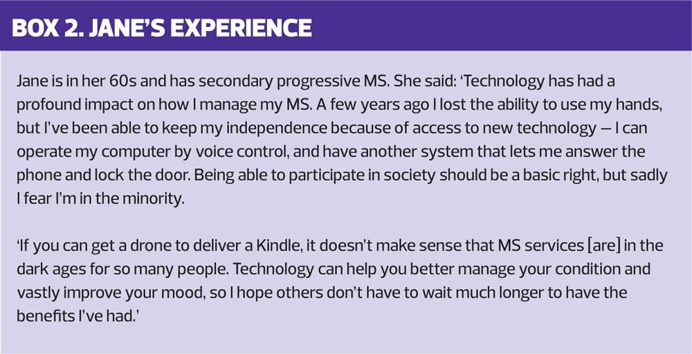 Digital technologies can help people with MS maintain some independence. Look at Jane’s experience. (Box 2) In order to support patients in this area there are some things you will need to consider.