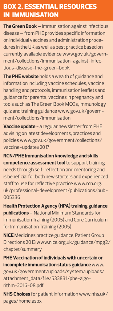 Without doubt vaccination saves lives and prevents serious illness and disability. Training that encompasses national policy and standards provides the foundation for furthering knowledge, the development of practical skills and achieving competence. Undertaking annual updates, keeping up to date with current issues and changes to the National Immunisation Schedules, understanding the handling and storage of vaccines, and accessing the abundance of valuable resources available are essential to the GPNs role. Annual anaphylaxis management and child and adult life support updates are also mandatory. Box 2 provides some essential immunisation resources. The Public Health England publication ‘Immunisation against infectious disease’ – The Green Book – is fundamental to practice.7