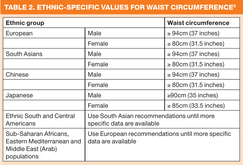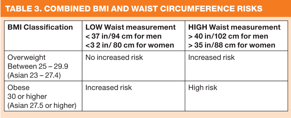 A combination of both a raised BMI and waist circumference measurement increases cardiovascular and diabetes risks (see box 4), hence using both the BMI and waist measurements give a much more accurate predictor of risk and in combination with other lifestyle risk factors, allows tailored health promotion advice to be given to the patient.
