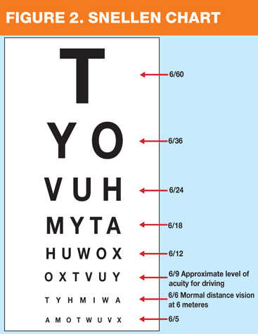 Normal vision is considered to be 6/6 and a vision of 6/9 is usually considered acceptable for driving.