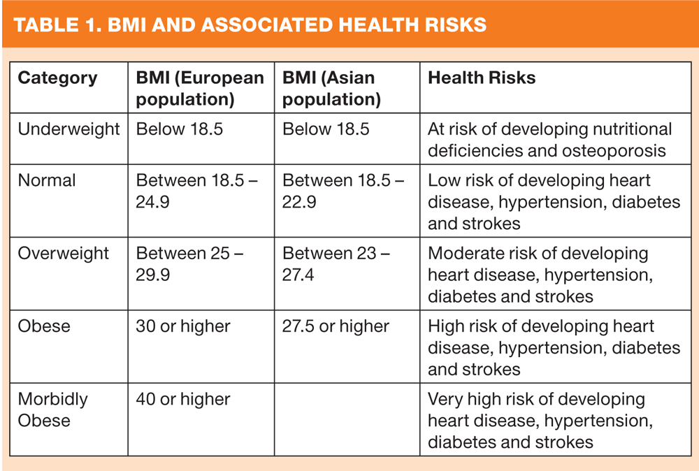 The advantages of calculating BMI are that it is cheap, it is quick, and on the whole, it gives a reasonable measure that can be useful for assessing obesity and its corresponding cardiovascular and type 2 diabetes risk. However, it does have its limitations, and while adjustments have been made for the Asian population due to their known higher proportion of body fat to muscle, (Table 1) it does not consider individual body fat distribution or where the body fat is stored, thus a patient with lean body mass such as an athlete could have a BMI in the obesity range.