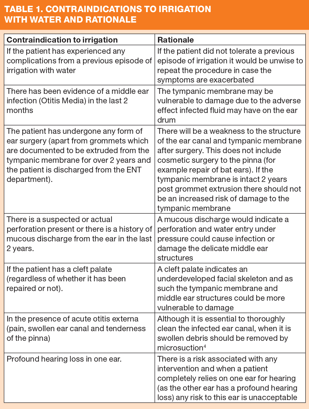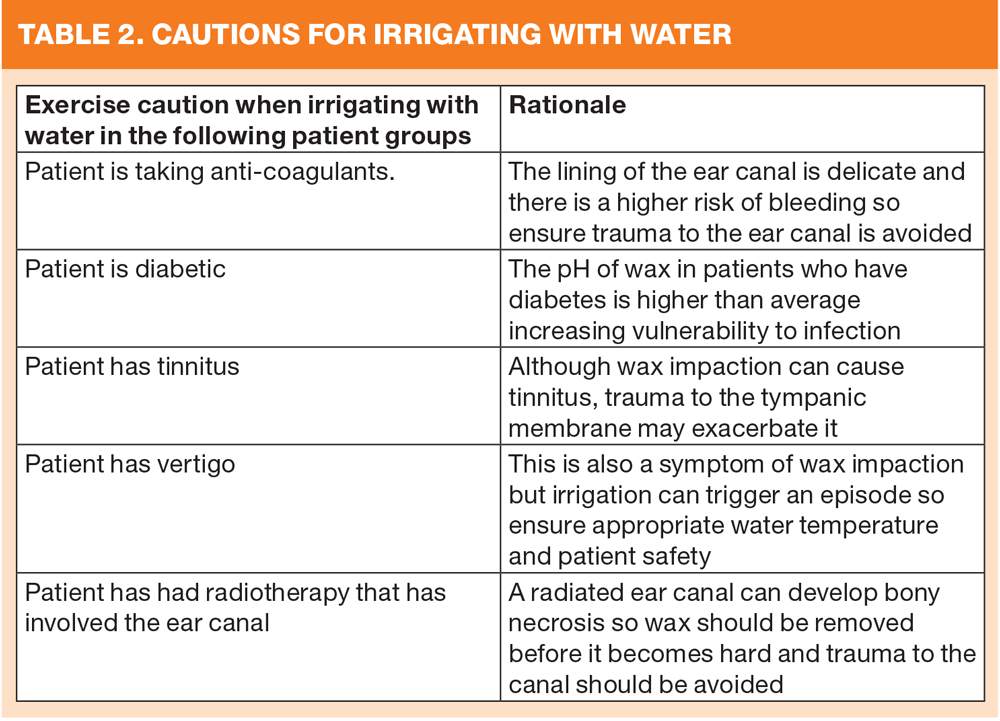 It is estimated that between 2% and 4% of people suffer from wax impaction: its removal is the most frequent ENT procedure carried out in the UK.2 Wax is usually removed by irrigation with water, and the procedure is most frequently performed by the practice nurse. Although approximately two million people in England and Wales have their ears irrigated with water every year,3 not every practice nurse in a surgery might carry out the procedure frequently. It can prove difficult to keep up to date with new information regarding contraindications to irrigation with water. Reasons why irrigation with water should not be carried out with specific patient signs and symptoms are listed in Table 1, and situations where caution should be exercised are given in Table 2.