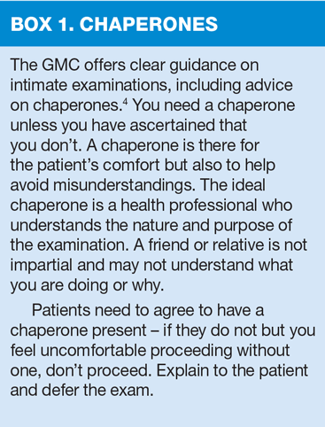 4. GMC: Intimate Examinations and chaperones: http://www.gmc-uk.org/guidance/ethical_guidance/21168.asp