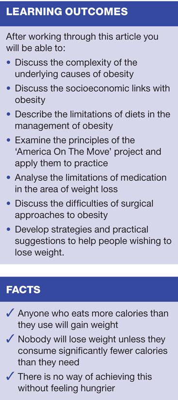 Practice nurses are at the forefront of the need to curb the national epidemic of obesity but are frequently faced by patients despondent at their failure to lose weight and angry at our failure to offer an easy and effective solution. This article examines the problems, and what we can offer