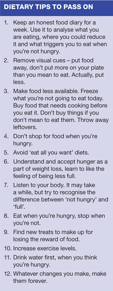 This offers us some strategies for weight loss, such as reducing temptation. Avoid buying cakes and biscuits. Freeze bread the moment you get home, keeping out only what you need for the next meal. Throw away leftovers on plates unless you need to save them. They are better in the bin than around your waist.