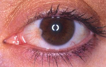 The meibomian glands, which are located inside the eyelid, secrete a fatty substance into the tear film that enables the eye to remain lubricated. When the duct from the gland becomes blocked, the secretions have nowhere to go and this predisposes to the development of a cyst - a nodule containing fluid or pus. These are more likely to develop in people with conditions such as blepharitis and acne rosacea. They can be differentiated from a stye, which manifests as a localised infection at the base of an eyelash. Treatment includes massaging the cyst with a warm flannel to see if this will encourage drainage. The cyst in this picture was infected and required a course of flucloxacillin. If this cyst remains it may be surgically removed.