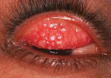 This eyelid belonged to a sufferer of allergic conjunctivitis, which was one of his symptoms of hay fever. His symptoms included intensely itchy eyes with the sclerae becoming red and the eyelids a little swollen. The eyes were a little sticky in the morning but there was a clear watering of the eyes from time to time during the day. Anti-allergic eye drops such as sodium cromoglycate or anti-histamine drops may be helpful in allergic conjunctivitis but in view of the severity of this patient's problem steroid eye drops were required. Care must be taken with the use of the latter when treating the 'red eye' to avoid the dangers of accidentally using them in a herpes simplex infection. Giant papillary conjunctivitis may also be found in contact lens wearers.