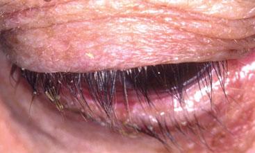 Blepharitis is an inflammation along the eyelid margin and may be divided into two origins: anterior, which is on the outside edge of the eyelid; and posterior which affects the meibomian glands, which are just inside the eyelid. Staphylococcal infection is the usual cause of the anterior form, and conditions such as rosacea and seborrhoeic dermatitis cause the posterior form. Treatment includes the use of a warm compress on the eyelids in the morning with some gentle massage to remove any crusts. To clean the eyelids, a solution of sodium bicarbonate (1 teaspoonful to a cup of boiled water that has been allowed to cool) should be used. I suggest dipping a cotton bud into the solution and cleaning the lids. Occasionally the lids may become infected and antibiotic drops are required. Where there is rosacea, antibiotics such as oxytetracycline may be needed.