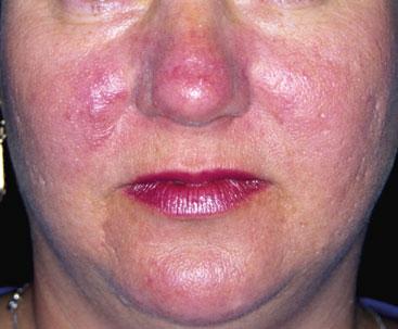 Rosacea most commonly occurs between the age of 40-50 years and in people with fair skin. The onset of the condition may be predicted by the development of flushing and redness of the skin. Flushing may occur as a result of consuming hot drinks and spicy food. The rash may develop on the forehead, cheeks and chin, and consists of papules, pustules and telangiectases. The absence of comedones helps to differentiate from acne vulgaris. The nose may develop an excess of soft tissue, which is more common in men, and is called a rhinophyma. The eyes may become involved with the development of blepharitis and keratitis. Initial treatment should be topical with metronidazole gel or azelaic acid. If this fails to cure the problem then an oral tetracycline should be used.