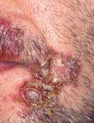Impetigo occurs much less commonly these days. Children are mostly affected but not exclusively so, as in this picture. The causative organism is usually Staph. aureus but impetigo may also be caused by the Streptococcus bacterium. A golden colour would suggest Staph. aureus as the cause. The picture shows a vesicular eruption and it can be presumed that if these vesicles coalesce, bullae will form. Treatment is with flulcoxacillin providing the patient is not allergic. From previous experience, this may not be sufficient and I usually recommend application of topical fucidic acid. The Health Protection Agency recommends that children should be off school 'until lesions are crusted and healed, or 48 hours after commencing antibiotic treatment'.
