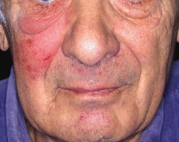 Erysipelas is an infection that affects the superficial layers of the skin. It is usually caused by streptococcal infection but staphylococci may the infecting organism. The nasopharynx is thought to be a reservoir for the infection. It is more likely to occur in those people who are diabetic, or have HIV disease. The patient may become systemically unwell with fever and rigors, which may precede the development of the rash. The affected skin becomes red and may be swollen. Treatment should be with anti-pyretics and phenoxymethylpenicillin. In those allergic to penicillin, a macrolide such as clarithromycin should be used.