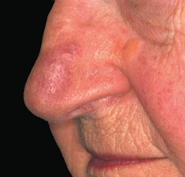Sarcoidosis is a multi-system disorder that affects, for example, the chest - hilar lymphadenopathy, or the eyes - anterior uveitis. It is more common in people of Africo-Caribbean, Scandinavian and Africo-American origin. When sarcoid affects the skin it may manifest in many ways, including plaques, nodules and papules. It may also cause erythema nodosum. One variety of skin problem is lupus pernio, where the disease affects the skin of the face and ears. It usually has a purplish appearance, may be lumpy and lead to tissue breakdown. Some patients are asymptomatic and the lesion on the nose of this lady was the first indication of the condition. As the sarcoidosis was considered to be inactive, the nose was treated with a potent topical steroid.