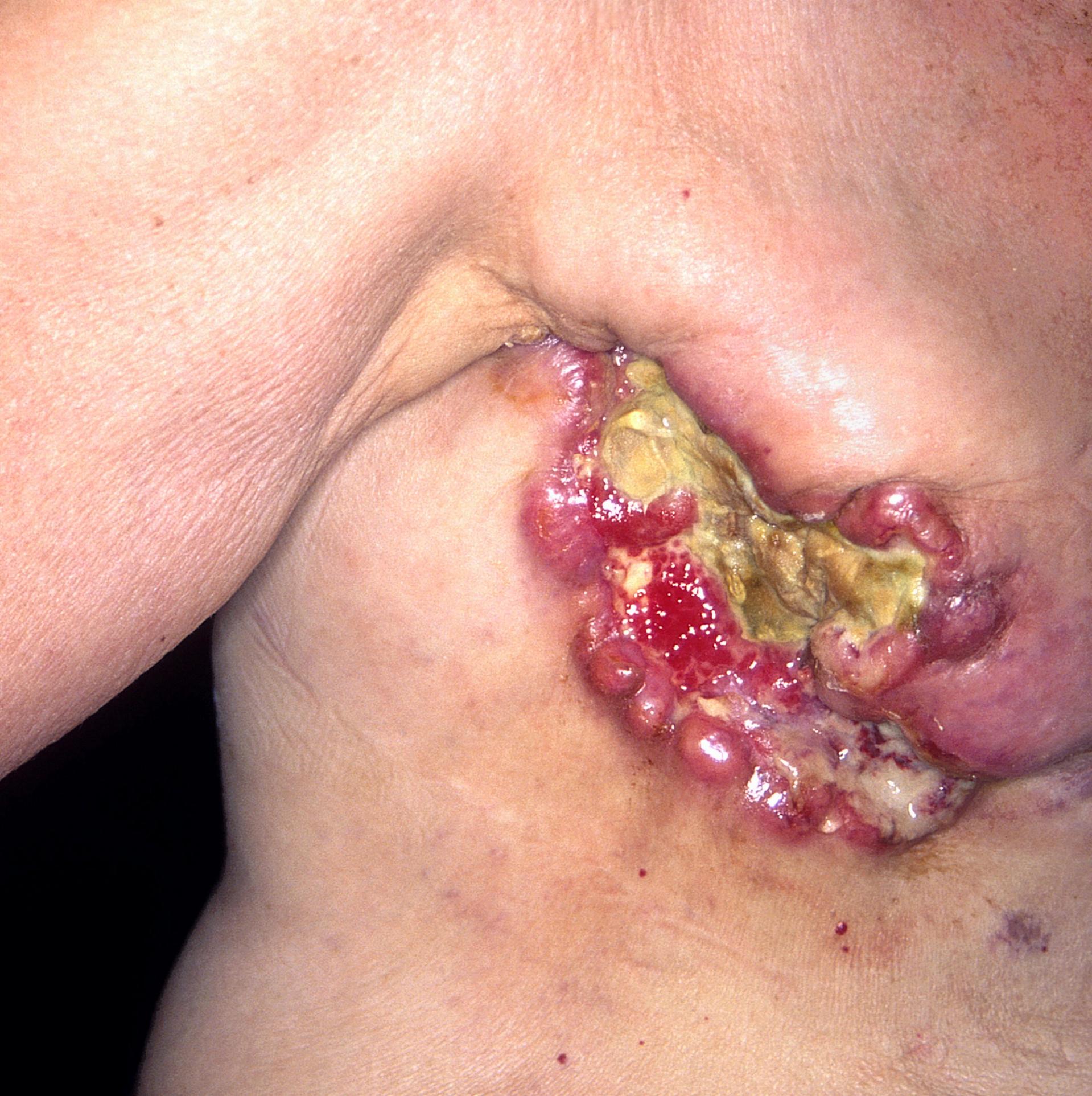 The diagnosis of cancer often creates fears about the likely impact of treatment or the uncertainties of long-term survival. Depression is common. Mastectomy may be considered disfiguring, and may lead to psychosexual problems. Women may also be worried by practical problems such as what to wear following a mastectomy, Advice and breast reconstruction may overcome some of these issues. But might these factors also prevent a women from asking for help, thus allowing a cancer to grow insidiously? Even the toughest practitioner would find the appearance of this fungating breast cancer very difficult to cope with. The patient was adamant that she did not want any palliative surgery.