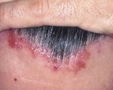 The scalp is one of the common areas to be affected by psoriasis, and indeed may be the only area affected. The skin is usually red with a slivery scale on top. Common places to find it include above the ears and the occipital region. The frontal region may be affected too, but often with less scale - as shown in the picture. It may extend outwards beyond the hairline. The scale may fall and so it is important to wear light coloured clothing to avoid embarrassment. The condition may be confused with seborrhoeic dermatitis (dandruff) but the scale is much thicker in psoriasis. Treatment can be with compounds such as coal tar solution, salicyclic acid, precipitated sulphur in a coconut oil (cocois). Alternatives include a combination of calcipotriol and betamethasone (Xamiol) which is formulated as a gel, arachis oil and coal (Polytar) tar and pure coal tar extract (T/Gel)