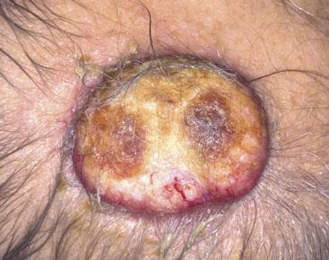 This lesion was noticed within a few days of birth. It was an orange-yellow patch, which felt waxy in texture with no hair growth on it. As an adult, the lesion may become more bumpy in nature (verrucous) and is prone to producing benign skin lesions. However, occasionally they may show malignant potential with the development of squamous cell carcinoma or basal cell carcinoma. The parents of the child require counselling about the risks and whether prophylactic excision is appropriate.