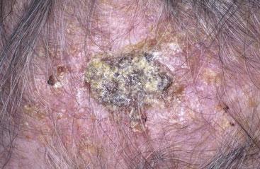 SCCs usually develop where there has been sun damage, so the bald male scalp is a high risk area. Actinic keratoses are a risk factor for the development of SCCs. Bowen's disease, seen more commonly on the legs, is also a fore-runner of the condition. Exposure to radiation and chronic ulcers are also risk factors. Transplant patients are also more at risk a result of immunosuppression and infection with human papilloma virus.