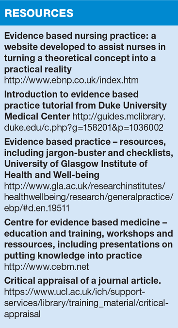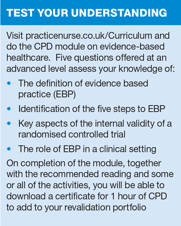 To be useful, evidence should enable you to do your job better: better outcomes for your patients and better professional satisfaction for you. The use of evidence by practice nurses is required by the Nursing and Midwifery Council1 as part of the Code, which is the reference point for all the requirements of revalidation.