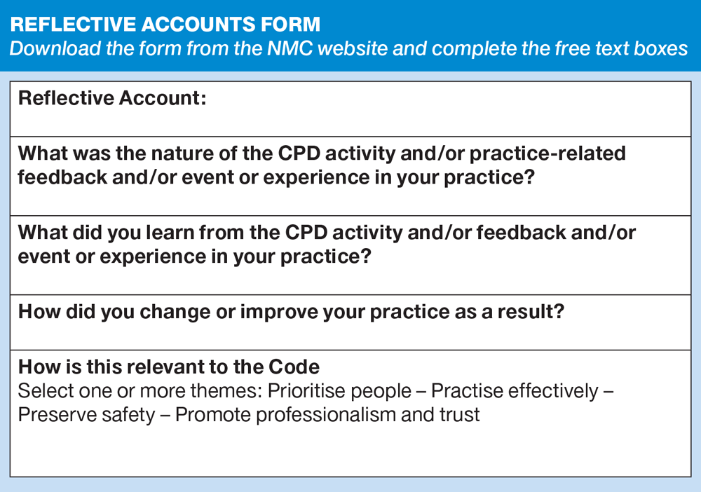 One of the new requirements is to write five reflective accounts over the three years since renewing your registration or joining the register. These accounts must refer to: