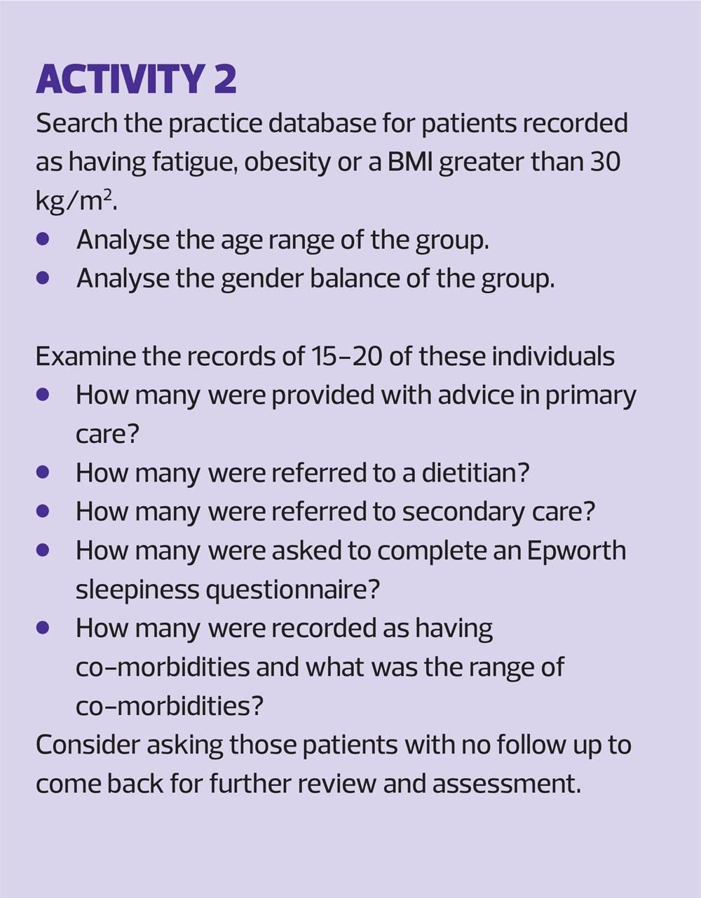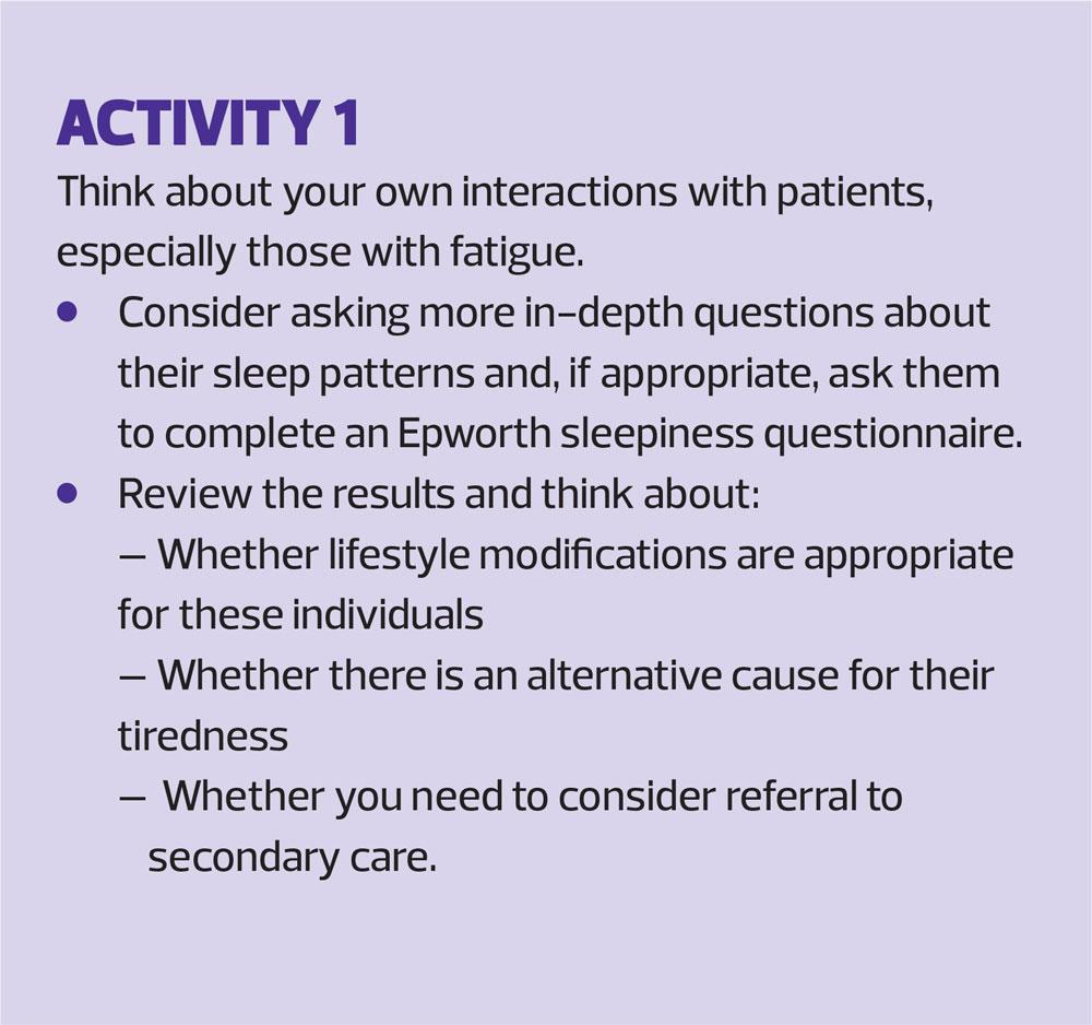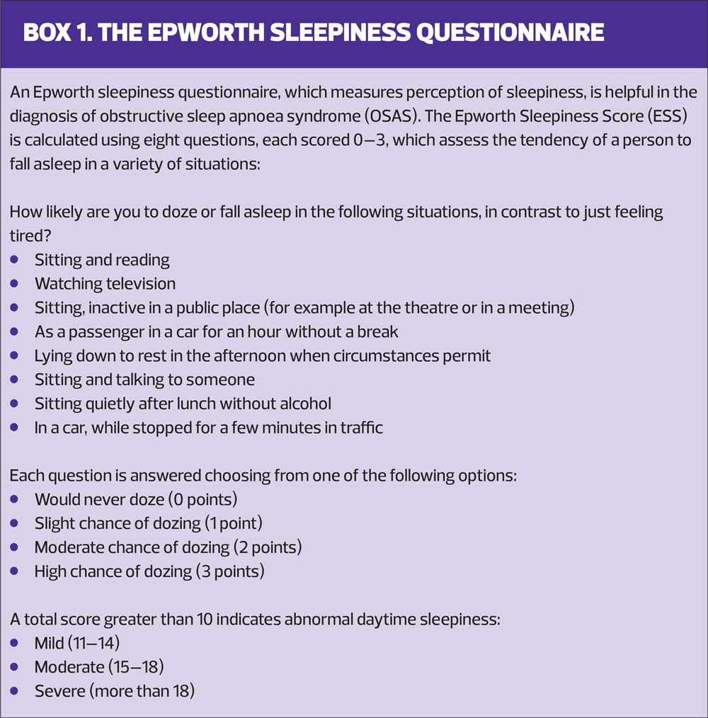 Check the person’s blood pressure, body mass index and neck circumference and ask them to complete an Epworth sleepiness questionnaire to assess the extent and severity of their symptoms (Box 1) You should also look for signs of chronic obstructive pulmonary disease (COPD), respiratory failure or cor pulmonale as this will influence the urgency of referral. Consider arranging investigations if you suspect an underlying cause, e.g. thyroid function tests if hypothyroidism is suspected.