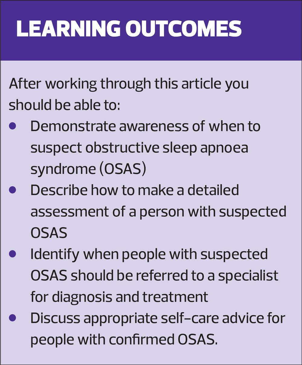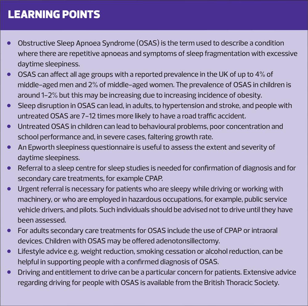 OSAS is almost certainly underdiagnosed in primary care so it is important that you are aware of the features that suggest it and refer appropriately. Once the diagnosis is confirmed there are a number of interventions that you can make that will be beneficial.